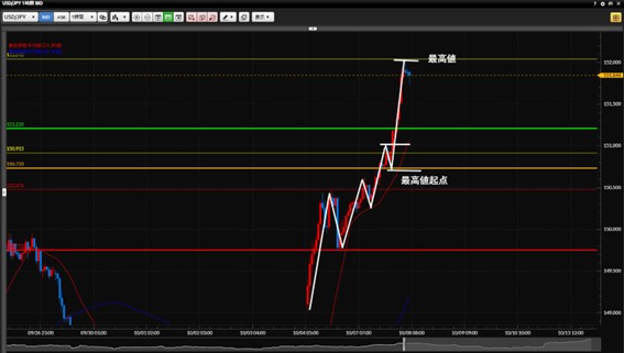 ②1時間足のローソク足実体で最高値更新が確定した後の5分足上昇トレンドの起点でロング