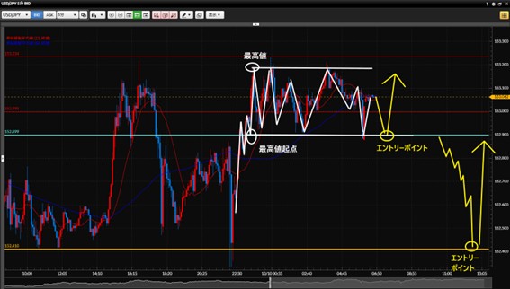 1時間足では「上目線」で最高値付近でレンジっぽい相場になっていますね。