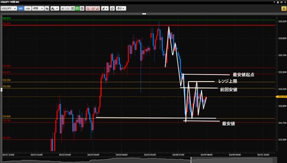 1時間足は「下目線」のなかで「レンジ相場」ですね。