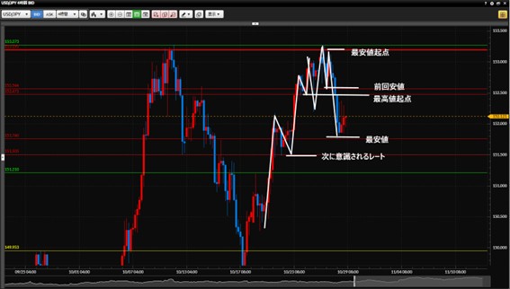 ②「①」が崩れたら1時間足最安値起点まで引き付けてショートエントリー