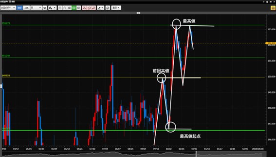 日足でも「上目線」ですが週足の最高値まで再び上昇し、ブレイクせずに下落しています。