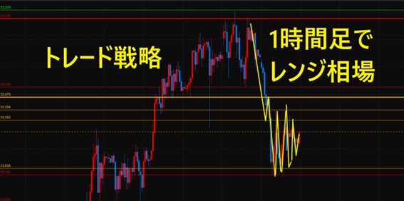 ①1時間足レンジ上限まで引き付けてショートエントリー