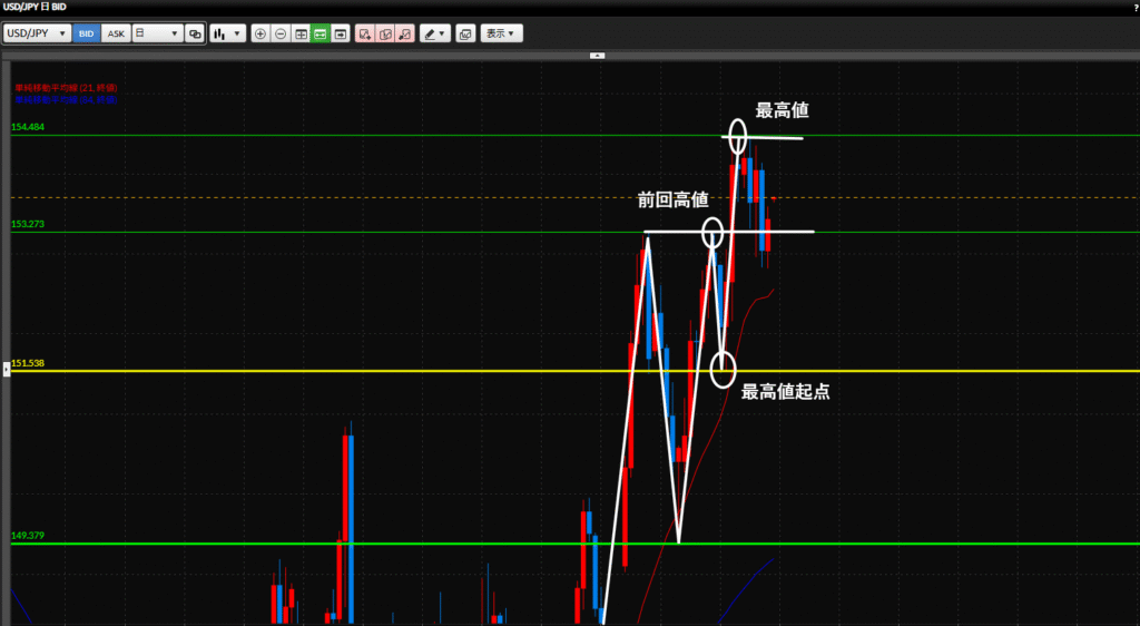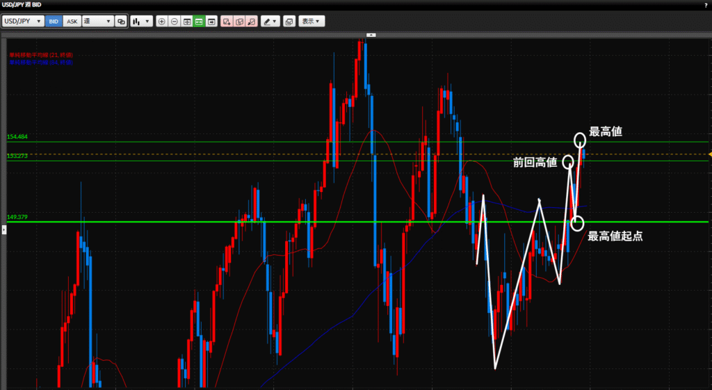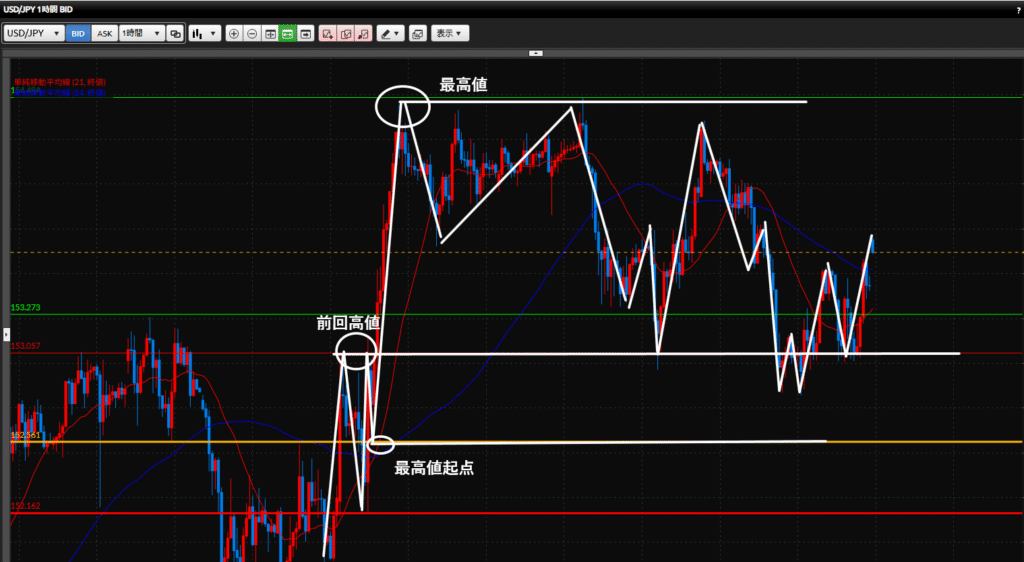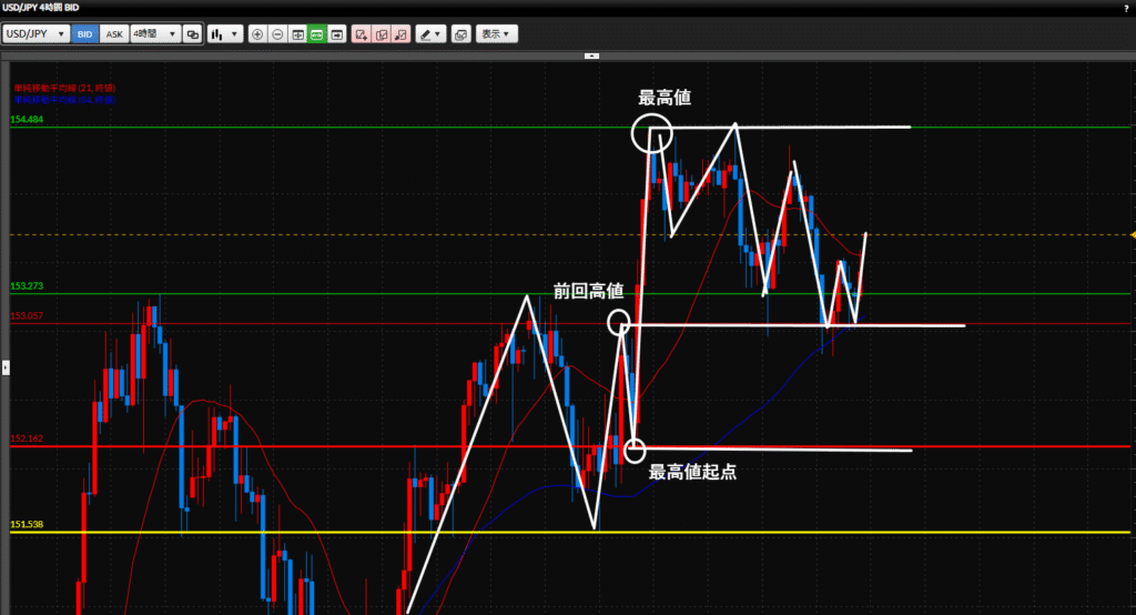 4時間足は「上目線」の中で前回高値と最高値の間で「レンジ相場」ぽくなっていますね。