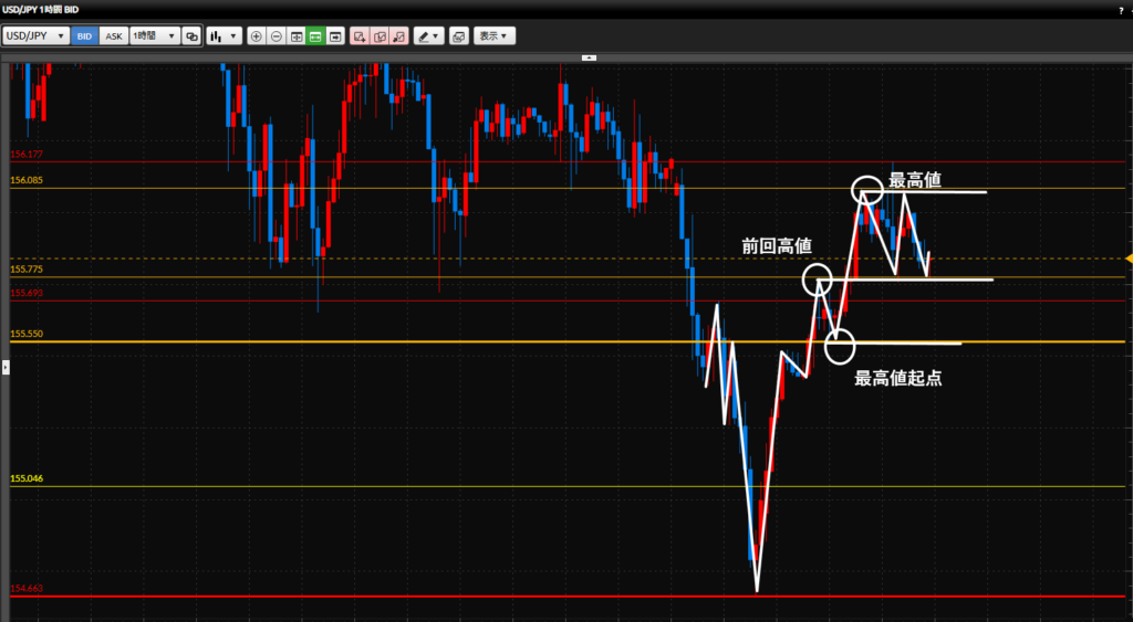①1時間足前回高値(レンジサポート)でロングエントリー