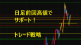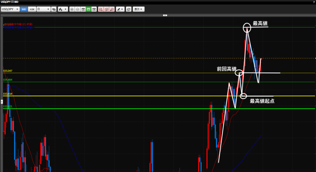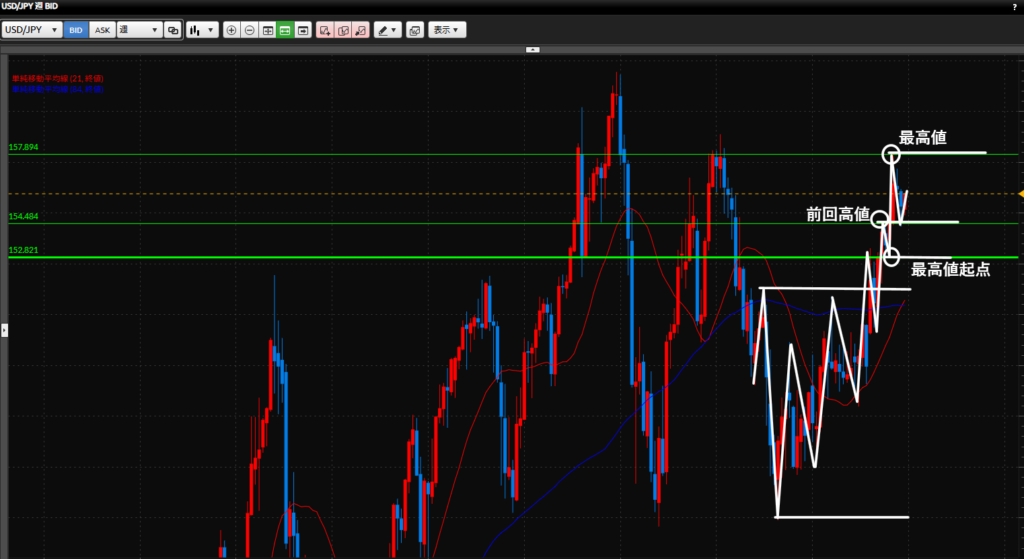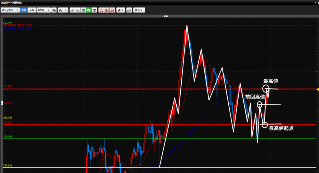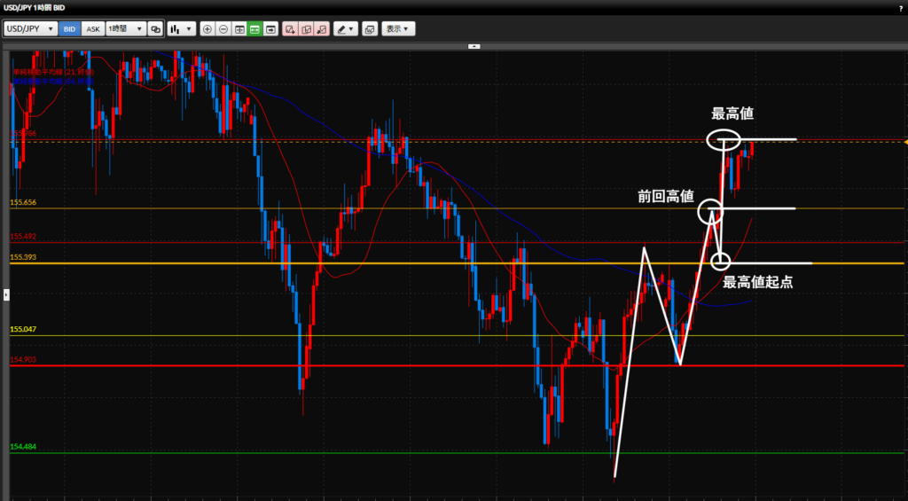 4時間足の最高値と同じレートなのでこの高値を更新すれば1時間足で最高値更新になります。
