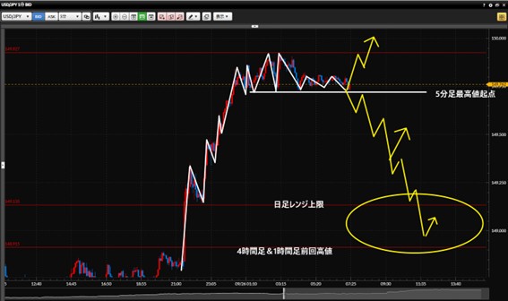 ②起点を下抜けして5分足で下降トレンドを形成する場合。