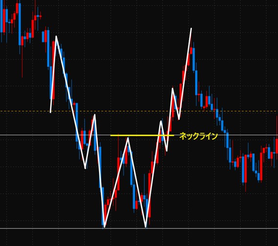 真ん中の山(ネックライン)には必ず水平線を引くことを意識しましょう。このネックラインをブレイクしていくと本格的に反転して上昇トレンドに切り替わることが多いです。