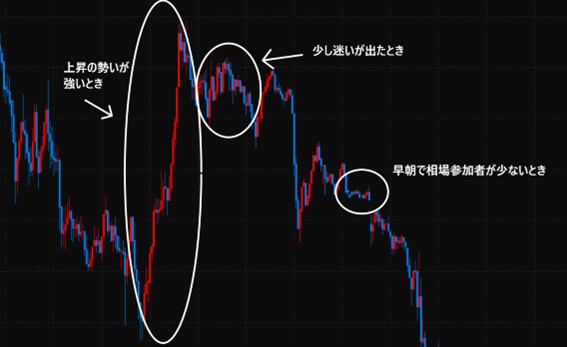 実際のチャートを使ってローソク足の動きを見るとぱっと見でもこのような情報がわかりますね。