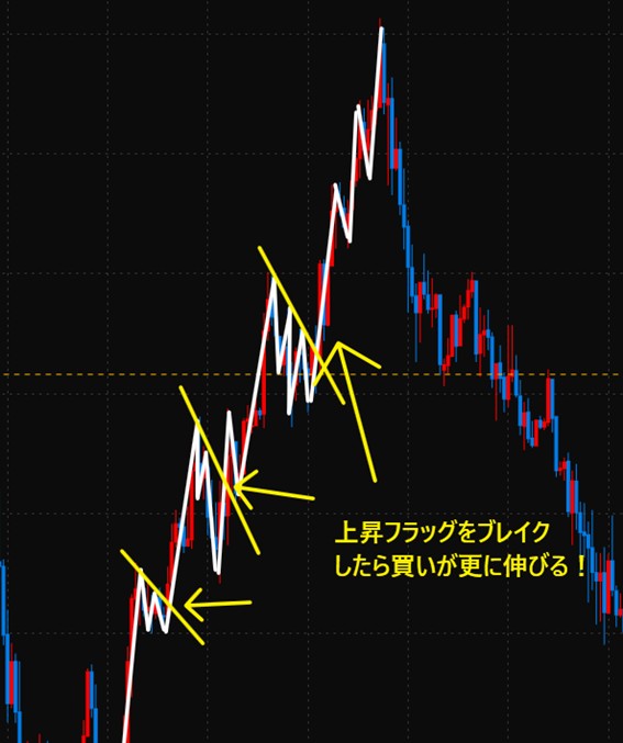 画像も一旦上昇トレンドが一休みすると同時に上昇フラッグが出現。そして突破後に再度強い上昇を繰り返していますよね。