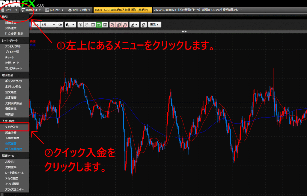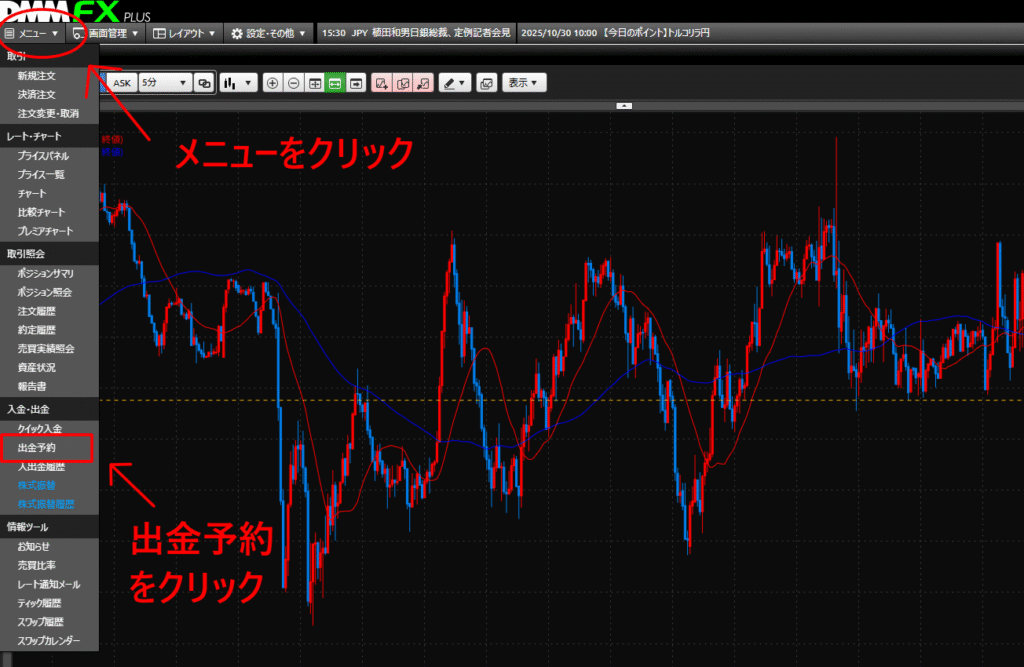 出金先の登録が終わったら再びDMMFXの画面に戻ります。「メニュー」をクリック