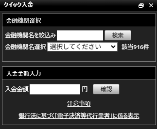 すると下の画像の様に、「金融機関選択」と「入金金額入力」という欄が出てくるので、それぞれ入力します。