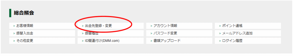 DMMFXマイページの下の方にある「総合照会」から「出金先登録・変更」をクリック。すると出金先の金融機関を登録する画面になるので、そこから自分の送金したい口座を登録していただければ大丈夫です。