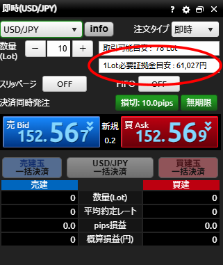 また新規注文を行う画面に、「1ロット必要証拠金目安」があります。この金額は「通貨ペア」や「その時の為替レート」によって異なり、最低でもこの金額以上の額を入れないと口座開設しても取引できないので注意が必要です。